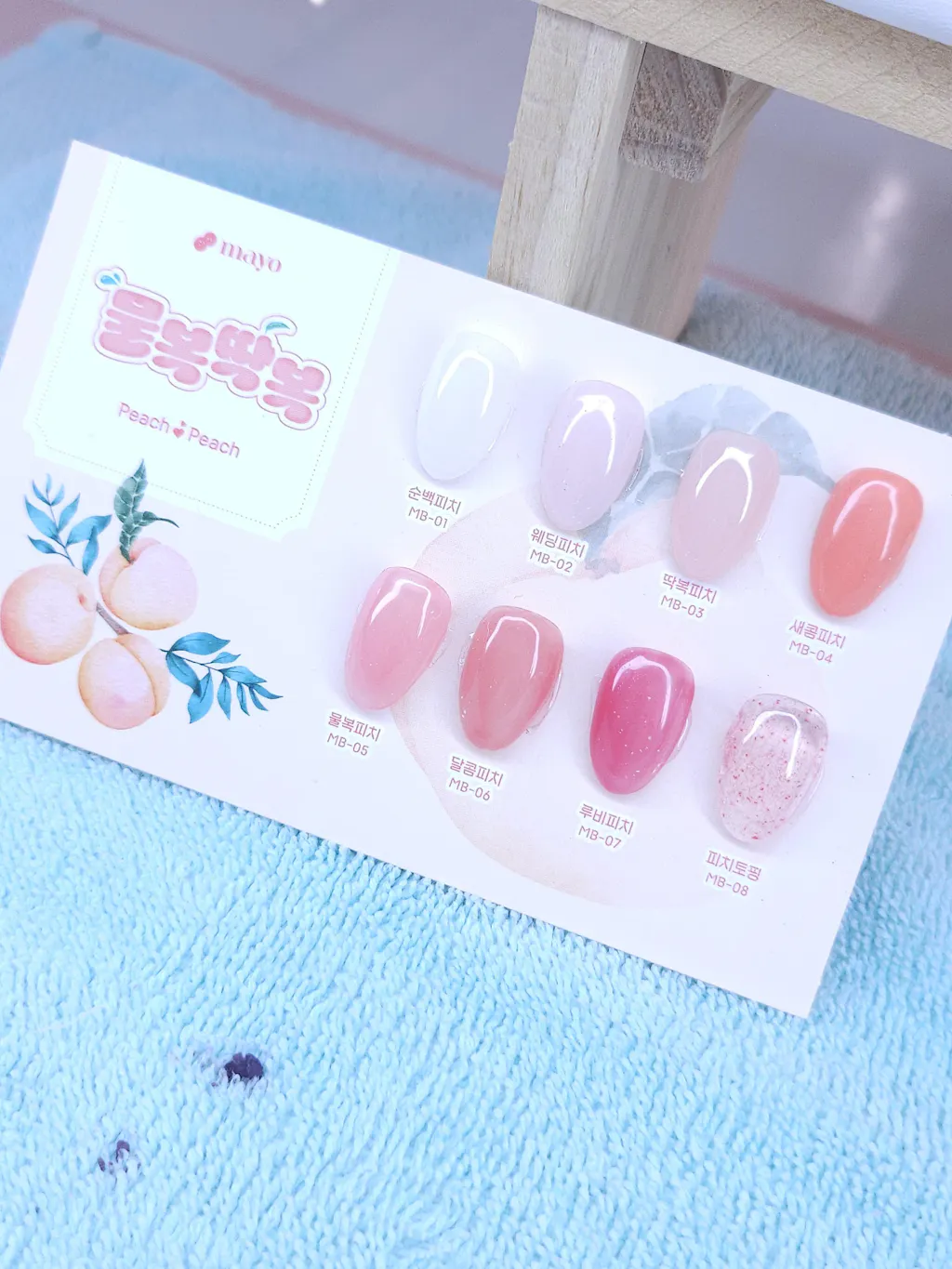 Pantone's color for 2024. Start off the Spring with fresh peach tones in 7 syrup gel polishes + 1 texture gel polish similar to peach fuzz.