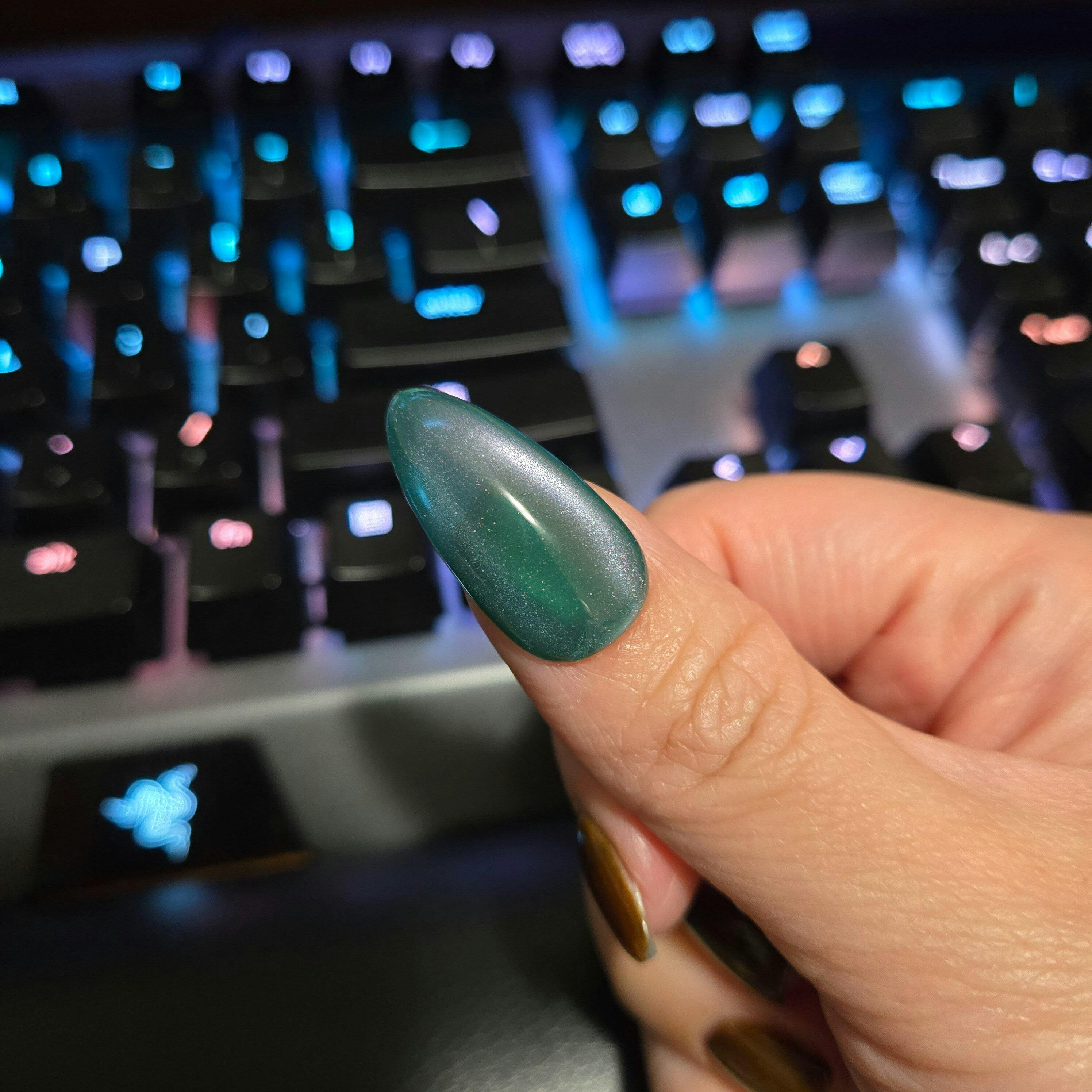 The magnet powders give off a pleasant soft glowy effect. But I kinda wish the base colour is less sheer. The picture is 3 coats on a size 1 nail tip.