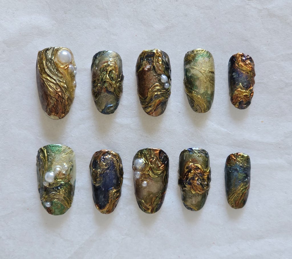 You can create a lot of different mystical effects by layering the ink underneath sheer color gel polish or on top as an accent. These colors can draw inspiration from other aesthetics found in nature like minerals and crystals.