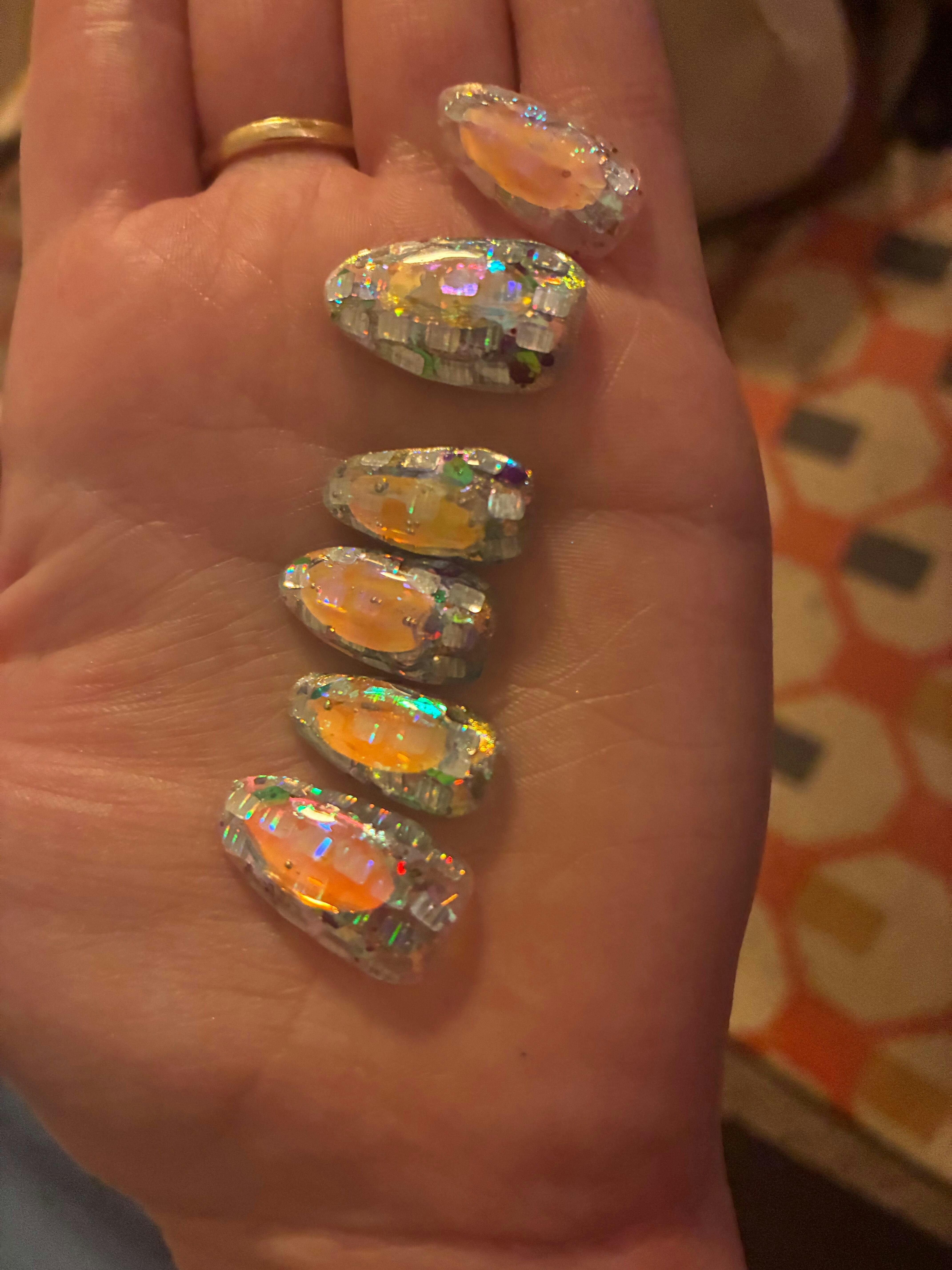 This high-brightness hologram features a mix of three sizes of the same color hologram, shining in various colors. Available in approximately 0.4mm, 1mm, and 3mm, it can be used together or individually. Its thinness makes it easy to fill, and when applied thoroughly, it creates a moist, lustrous finish.