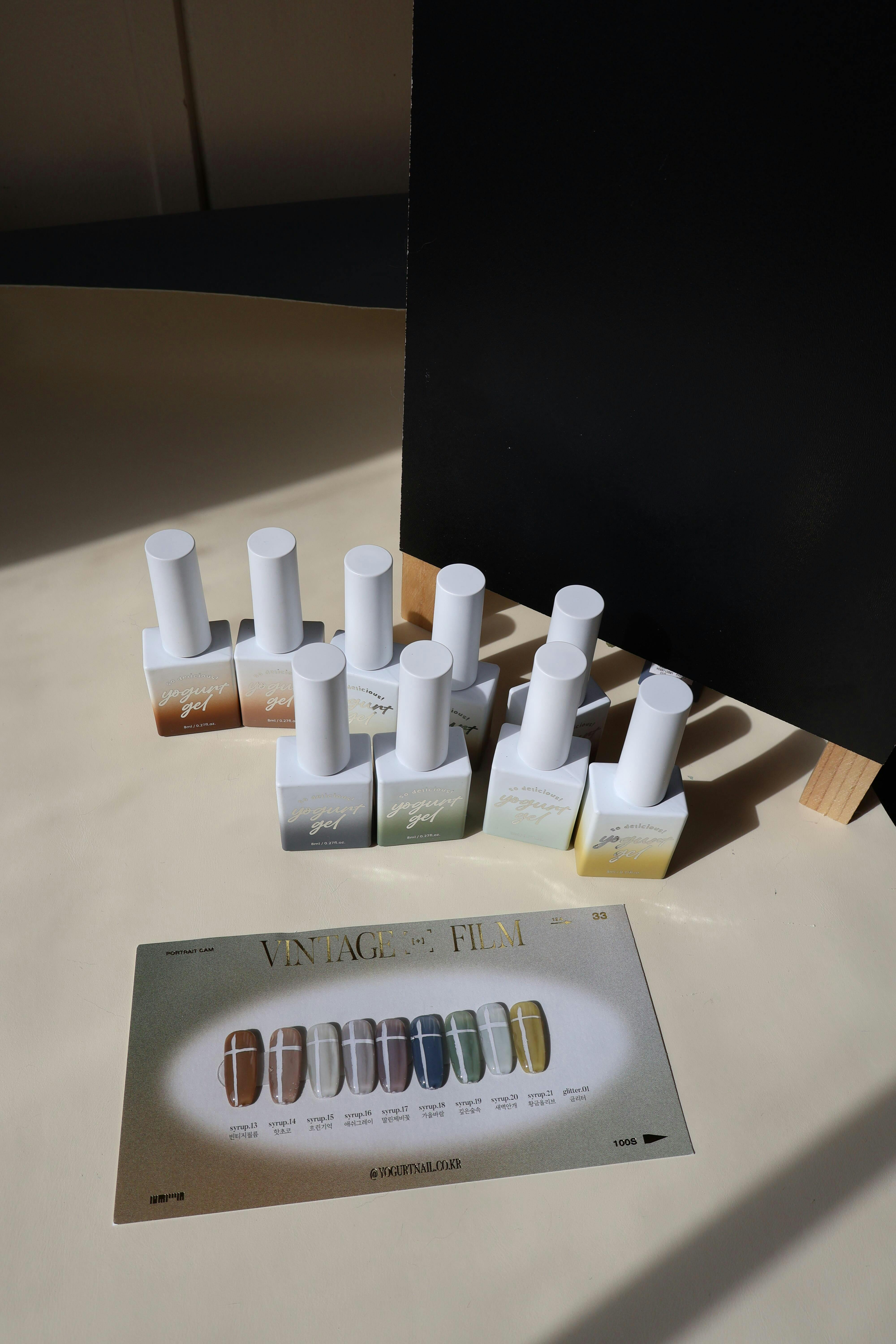 Vintage Film is Yogurt Nail Korea's Fall 2022 Collection. Can you imagine colors that bring back nostalgic film photography? In this set, there is a range of muted tone gel polishes from caramels to greys. Create classy, elegant nail art when you pick up the Vintage Film Set. Yogurt Nail Korea's first glitter gel makes a debut in this series!